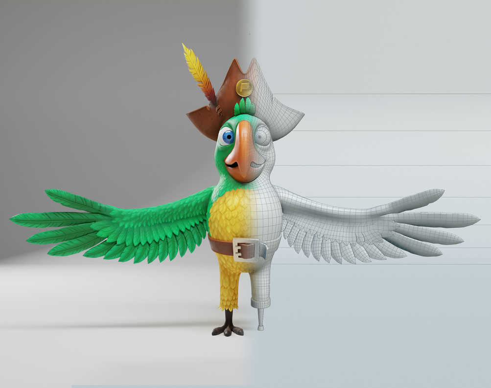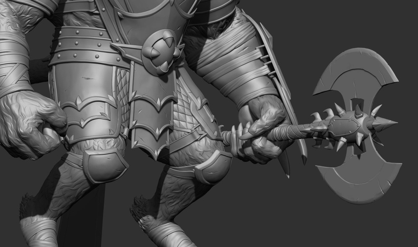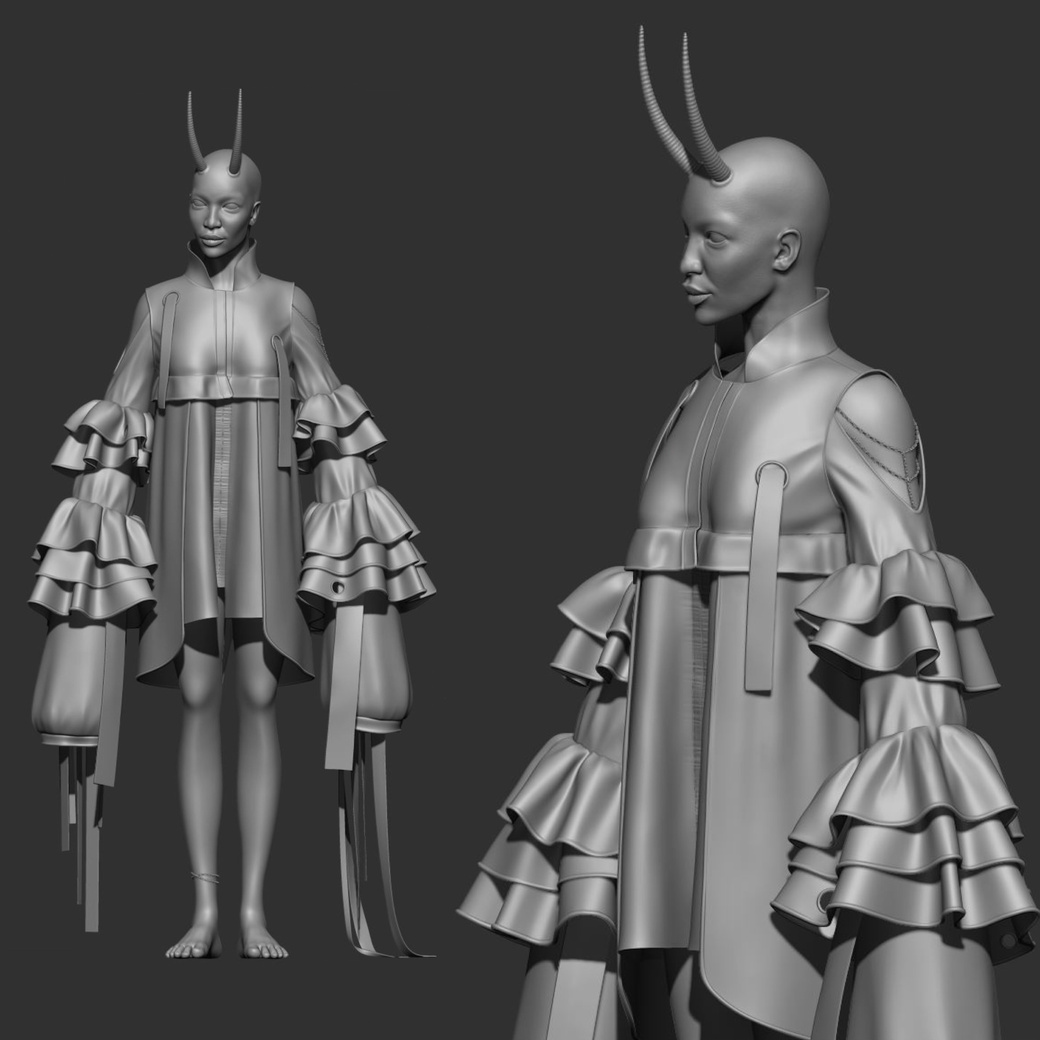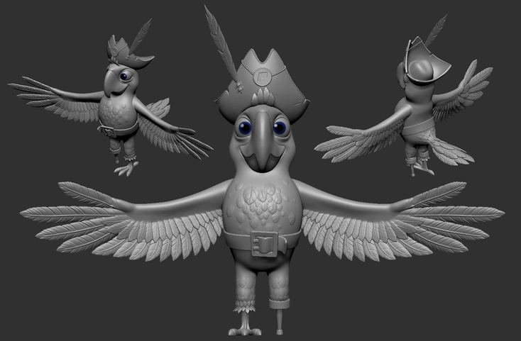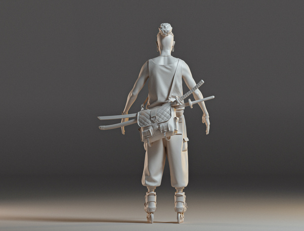 At this stage I work on the silhouette of the character and on all the details that affect its shape. For this I use Zbrush and Maya.